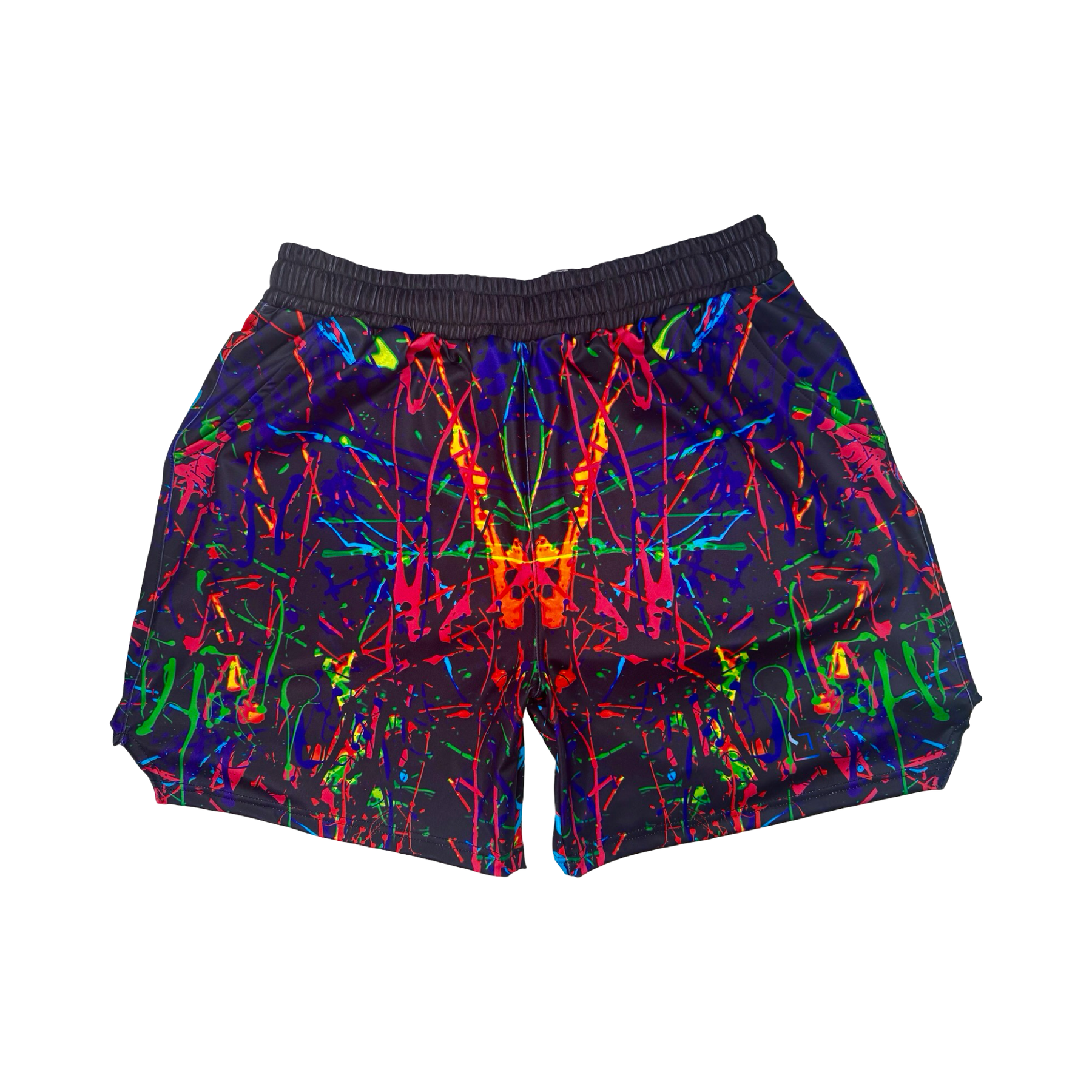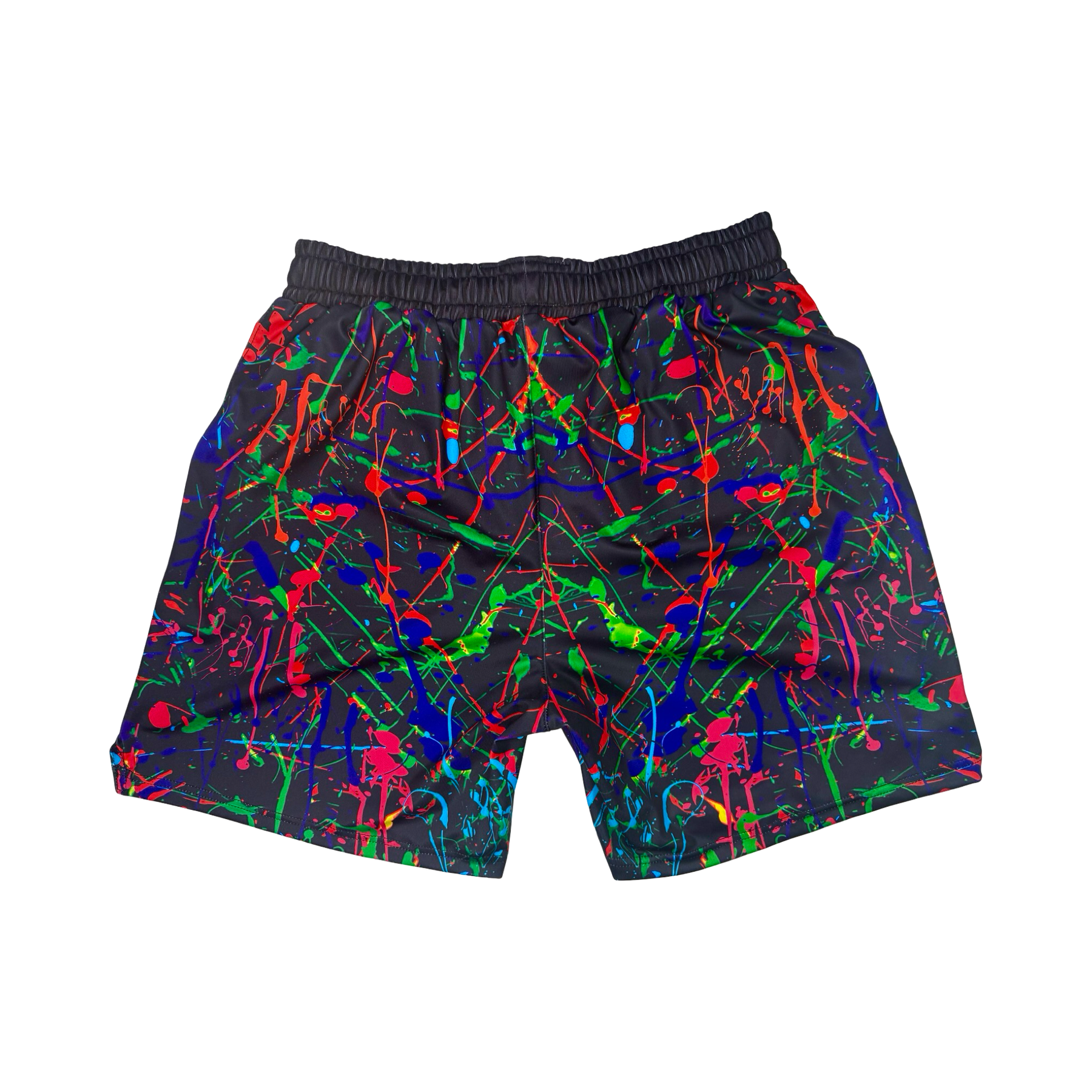 The Soft Quick-Dry PAINTd Black shorts explode with neon chaos—electric reds, greens, blues, purples, and oranges splashed across deep black. A full-spectrum paint-splatter effect that feels alive, loud, and kinetic.
