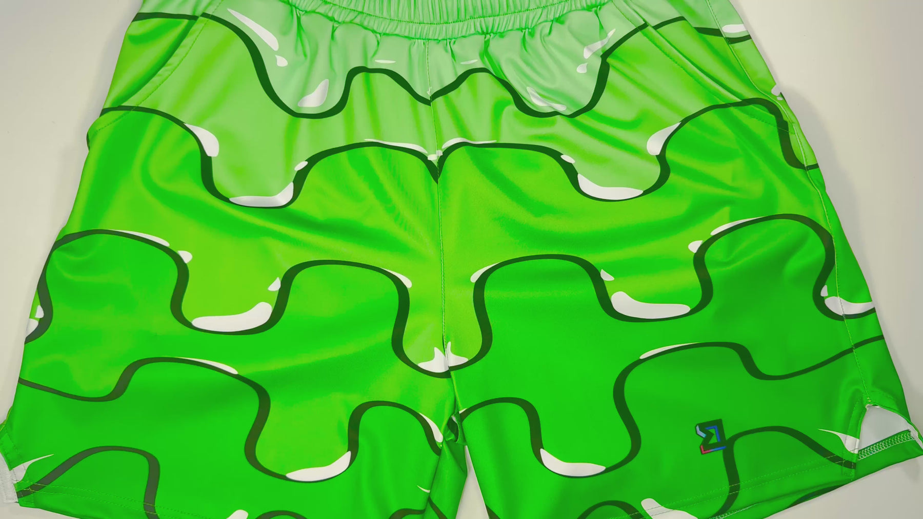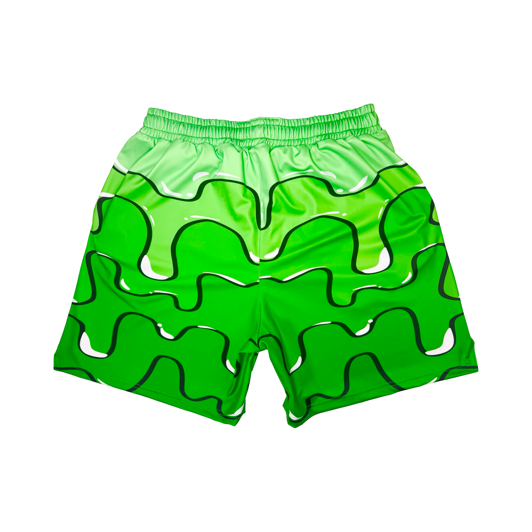 The Soft Quick-Dry Slimed shorts come through glowing—electric neon green dripping into deeper tones, wrapped in a glossy, liquid-style pattern that looks alive on the court. A bold, high-energy graphic built for hoopers who like colorways that refuse to whisper.