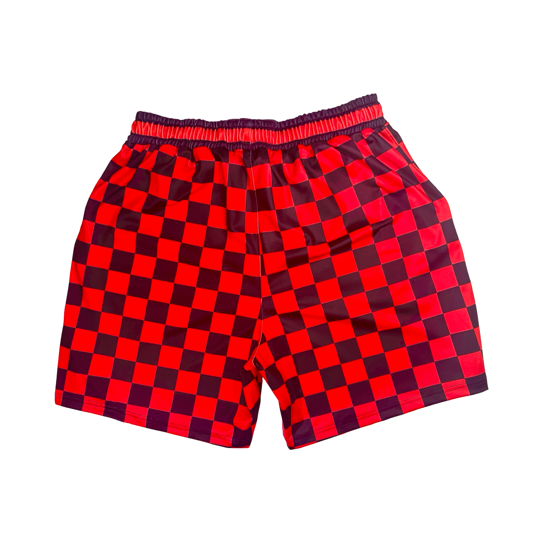 The Soft Quick Dry Checkmate Red shorts deliver a bold black-and-red pattern with a smooth lightweight feel—made for hoop runs, training days, and everyday streetwear flex.