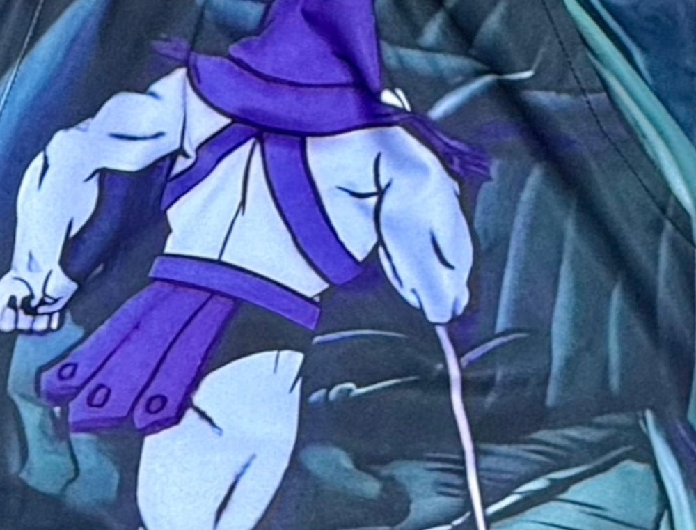 The Soft Quick Dry 80s Villain Graphic shorts feature a purple-toned forest scene with a bold cloaked character—built for hoop runs, workouts, and meme-level streetwear.